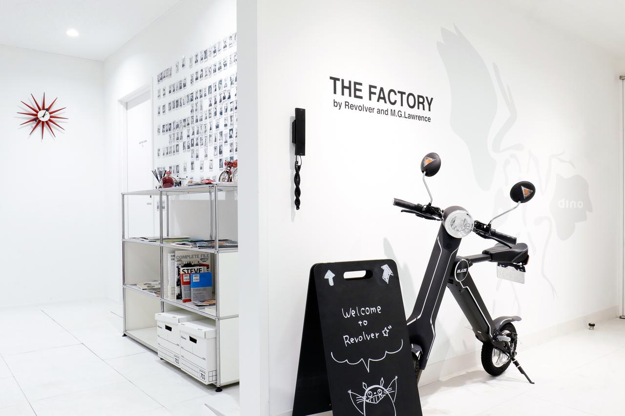 エレベーターの扉が開くと、目の前に現れるのは「THE FACTORY」と記された壁と、一台のバイク。この場所は、Revolverが大きな転機を迎えた"新しい出発点"です。